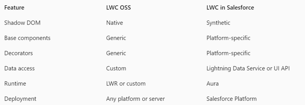 As you can see from the table, LWC OSS and LWC in Salesforce have different trade-offs and advantages depending on your use case and preferences.
