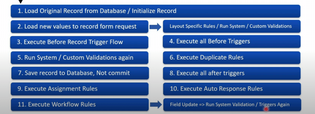 What’s the order of execution for: Before Trigger → Validation Rule → Workflow Rule → Process Builder → After Trigger → After Flow?