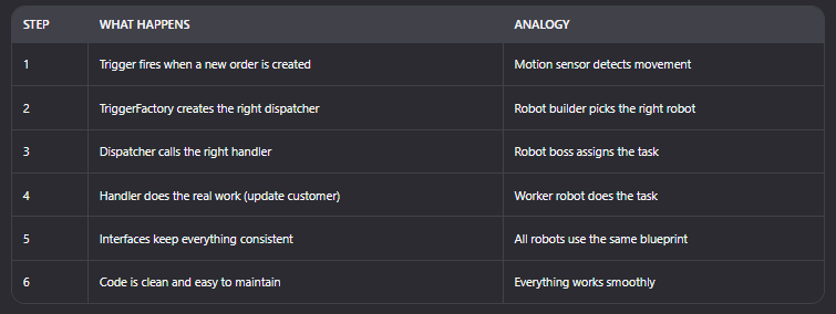 This system helps Salesforce developers organize their code so that when something happens (like a new order), the right code runs in a clean and predictable way. It’s like building a robot army where every robot knows exactly what to do.