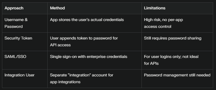 Integrations and third-party apps would typically request the user’s actual Salesforce username and password to perform API operations. The app would store these credentials and pass them directly to Salesforce each time. - Risks: